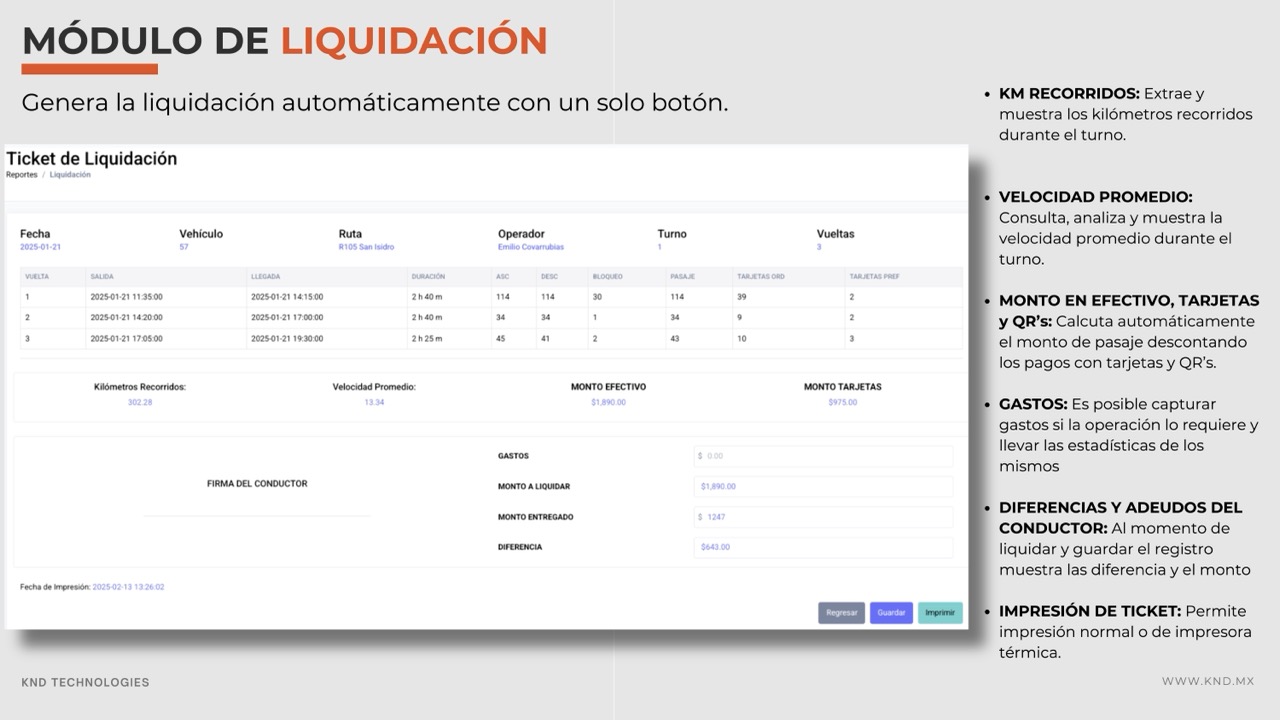 Automatiza la evaluación de vueltas y liquidaciones por ruta, turno, día, vehículo o conductor.